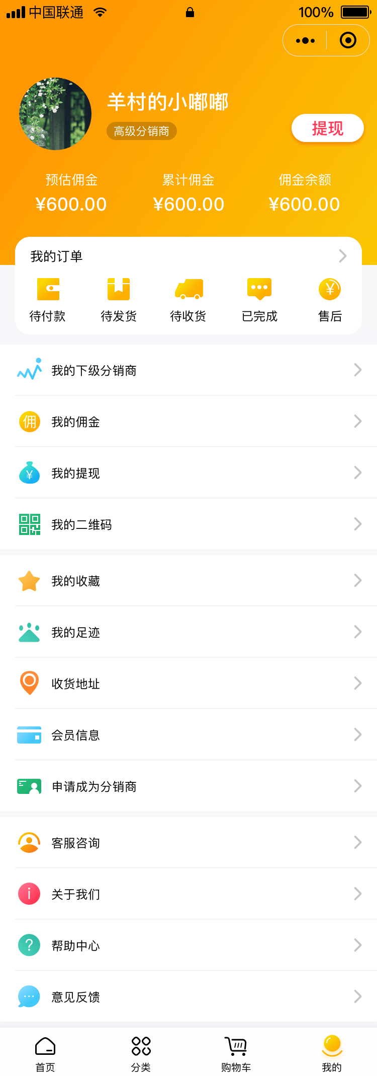 - 我的佣金: 商品推荐、商品分销可获得佣金,展示佣金来源、佣金链条。