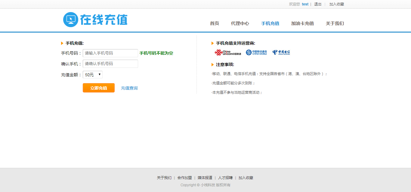 - 手机充值: 移动、电信、联通手机号码在线充值。